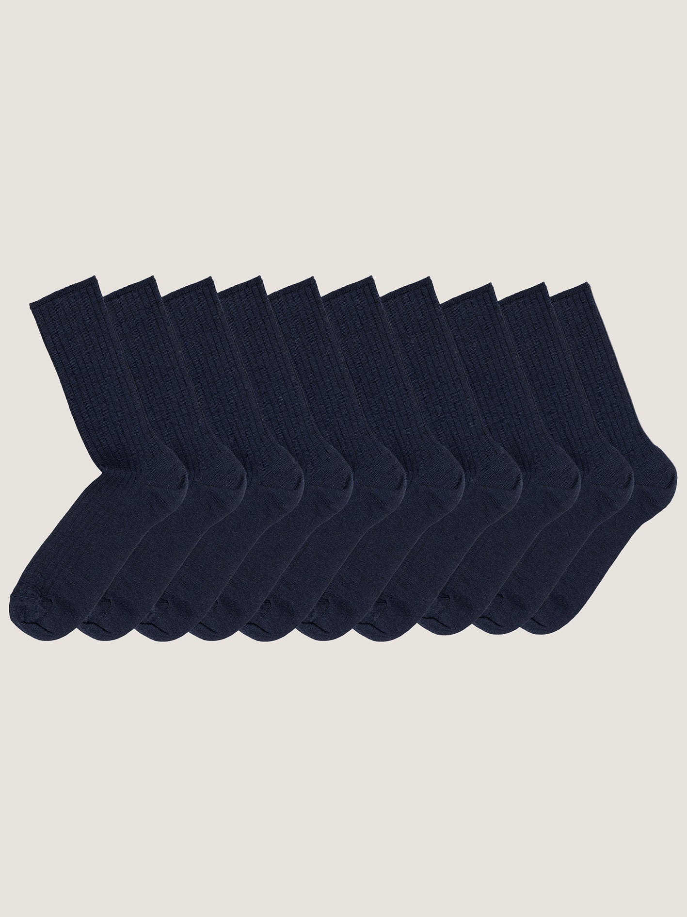 10 par ullsokker som kombinerer førsteklasses håndverk med maksimal komfort. Strikket med 168 nåler i klassisk ribbestrikk, uten stram elastikk som klemmer rundt leggen.