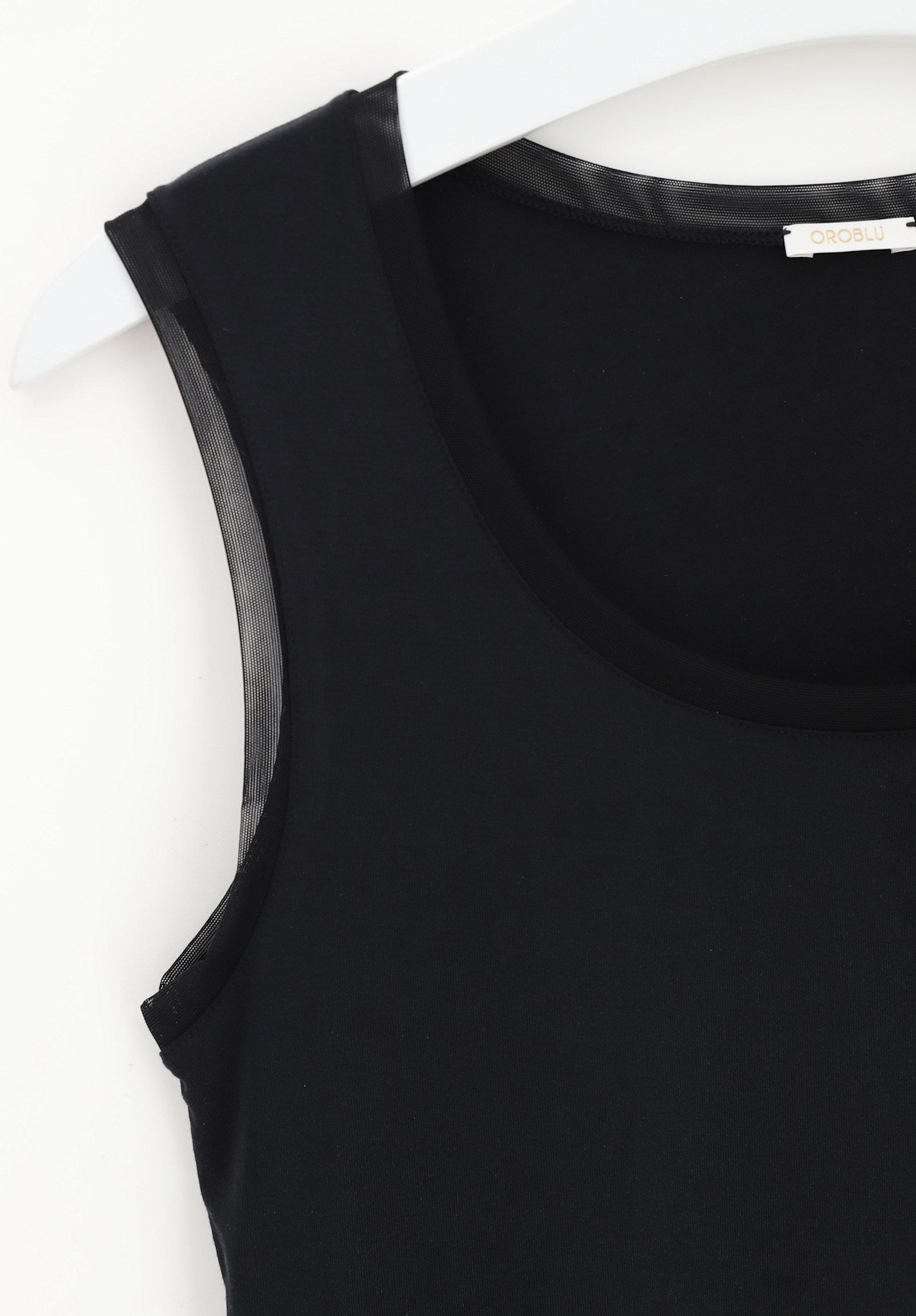 Oroblu Perfect Line Modal Tank Top er en tidløs og allsidig tankto, et, perfekt baseplagg. Laget i supermyk og lett micromodal med stretch, gir den en perfekt passform og en følelse av luksus mot huden. Den har brede skulderstropper og delikate tulle-detaljer rundt ermer og utringning. Takket være den kroppsnære fasongen og pustende kvaliteten er den ideell under gensere og jakker, eller alene på varme dager.