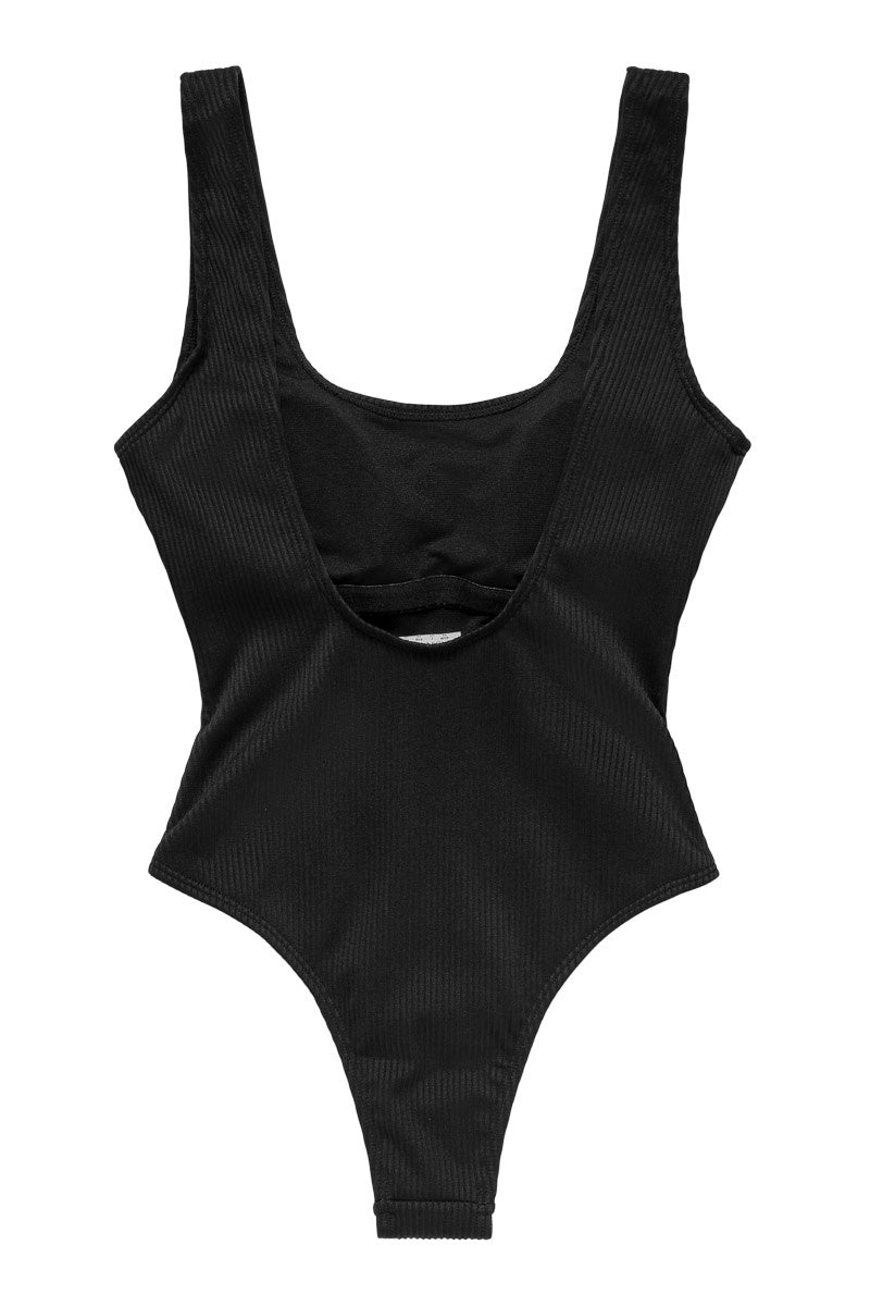 Enkel, stilig badedrakt med høy skjæring over hoften.