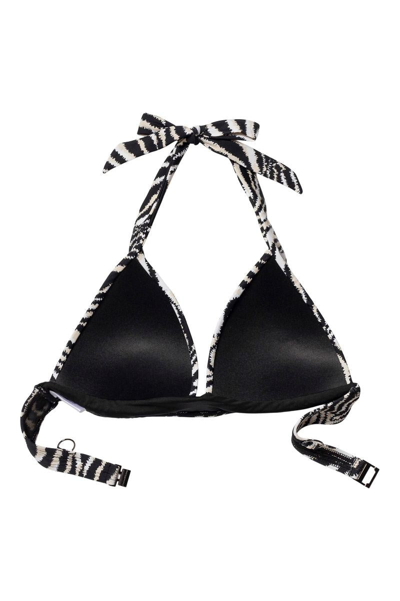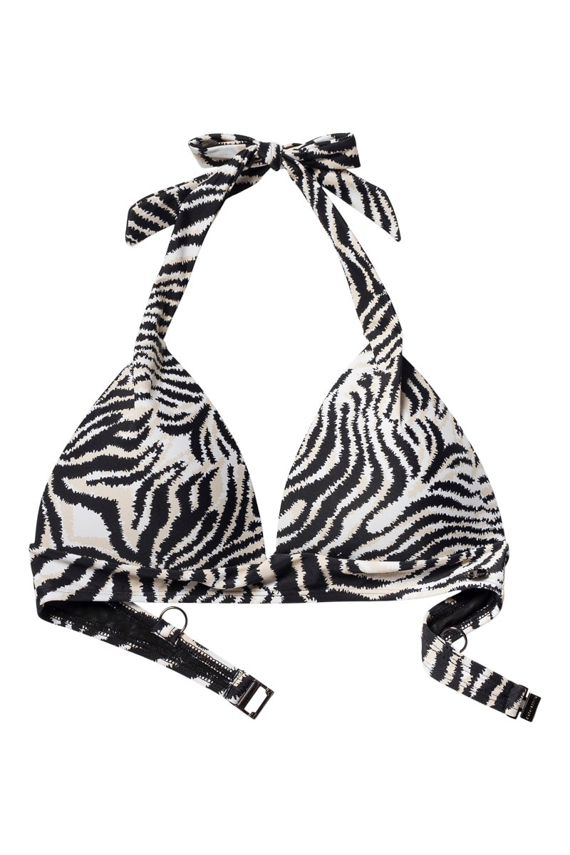 Zebra mønstret triangle bikini topp med drapering. Brukes som halterneck eller som skulderstropper ved å knyte stroppen til skulte ringer i ryggen. Vatterte cupper.