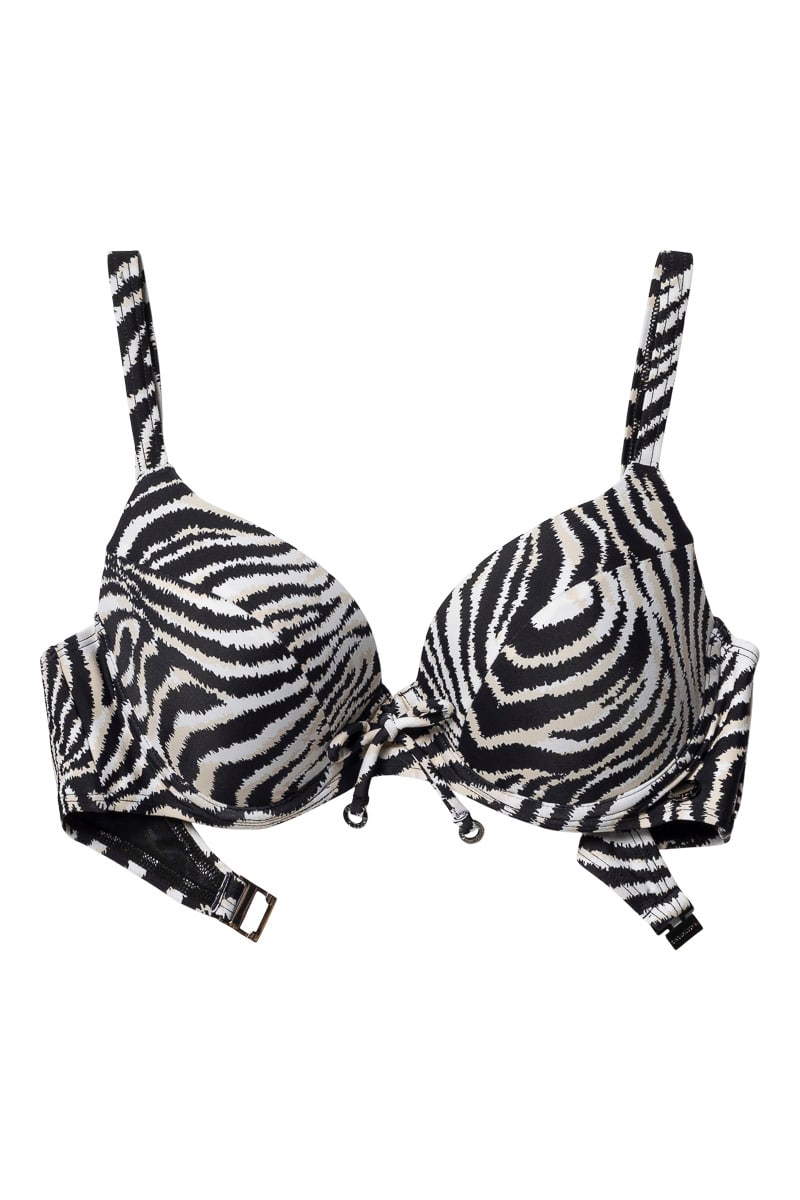 Push-up bikinitop i zebra mønster. Under wires og formet cup med innleggsputer som kan tas ut og forsterket netting i siden. Passer A - C cup. Dekorativ sløyfe i front. Dette er en av våre base modeller.