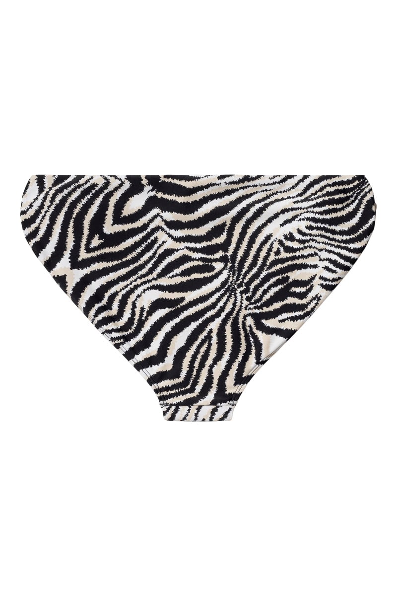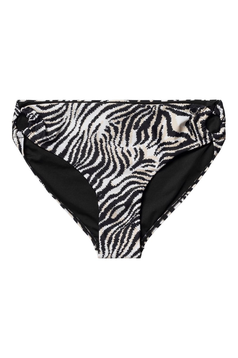 Bikini underdel i zebra mønster med dekorative ringer og drapering i sidene. Ordinær passform.