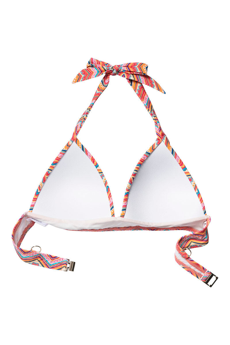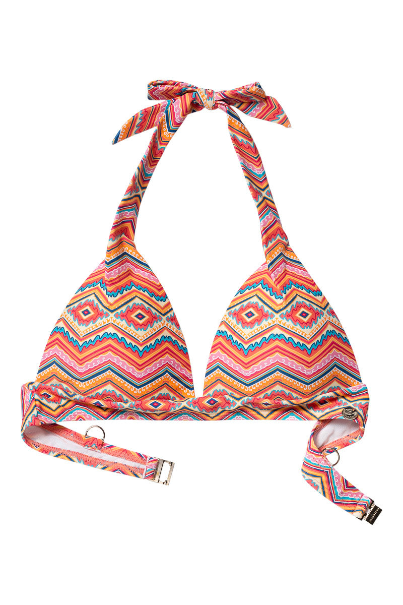 Fargerik printet triangle bikini topp med drapering. Brukes som halterneck eller som skulderstropper ved å knyte stroppen til skulte ringer i ryggen. Vatterte cupper.