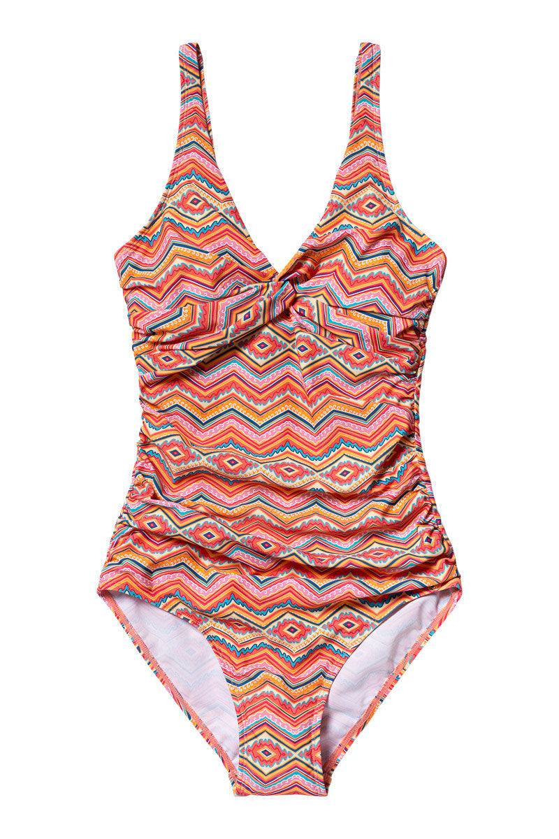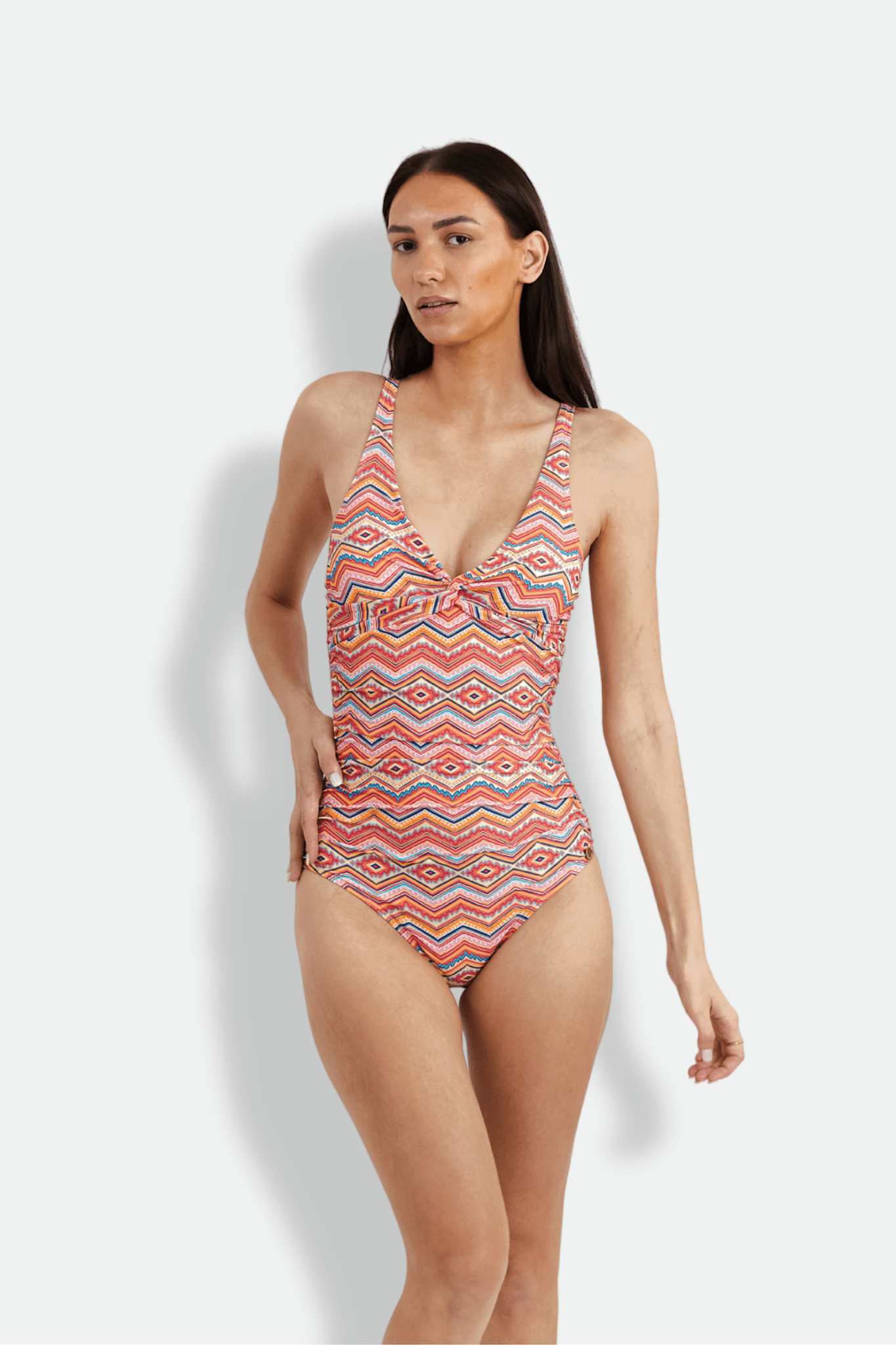 Badedrakt i fargerikt print med en tvist mellom cuppene. Den har V-hals og vakker drapering som sammen gir en svært flatterende passform.